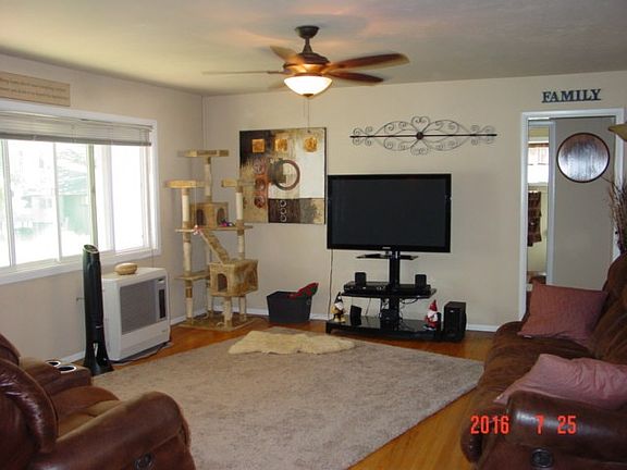 Don't miss this opportunity! This well maintained home boasts 3 bdrms & 3 full baths.Open concept living rm, dining rm & kitchen w/ hardwood flooring throughout.New gas range & microwave in the kitchen w/ beautiful slate counter-tops, bay window & a door leading onto the back patio.Wake up & enjoy your coffee while you enjoy the space in this beautiful home.The large windows in the living room make this room light & bright.The wood stove w/mantle make it a cozy space in winter months.It has 2 master bdrms on either side of the home, both with en suites.One recently updated w/ new laminate wood flooring.Also new ceiling fans, lights & window coverings.This would make the perfect in-law quarters.The one currently being used as the master has so much closet storage (2 large closets & one walk-in), a large tiled shower, vanity & access to outside deck. The other bedroom has new paint & is located next to the main bath.The house sits higher off the street w/ great curb appeal. Large covered front porch & a landscaped front yard that resembles an English garden w/ beautiful perennial & annual flowers & flowering trees.The backyard, which is fully fenced, has plenty of room for the pets or a garden.The covered patio & deck are perfect for entertaining.The large detached 2 car garage is drive-thru and has a shop.The carport is large enough to protect 2 vehicles & driveway provides off-st parking.This home is perfect for a growing family or family seeking separate space for privacy!