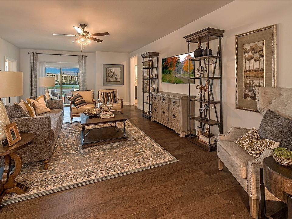 maintenance free community. The Wiltshire is an open floorplan with 9 foot ceilings throughout, Study or Formal Dining Choice, stainless steel appliances, upgraded kitchen countertops, large walk-in pantry, wood flooring throughout. The home includes 2 inch blinds, double oven, 5.5 inch baseboards and frameless shower. This home is located on the 3rd floor with a view of the amenities, easy access to the elevator and stairs, and common gathering areas. We like to brag on our amenities including lap pool, fitness center, pickle ball court, chess tables, putting green, and much more!