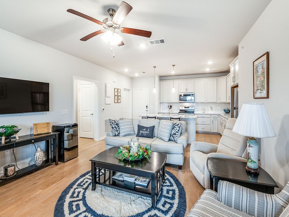 The Gathering Active Adult, 55+ community in Allen, Texas! Hurry to see this beautiful like new home! This 2 bedroom 2 bath unit features engineered wood floors in the living area, dining and kitchen. 1 Car garage adjacent to building, covered parking, community Pool, community garden, fitness center, pickleball court, grilling stations, party room, putting green, and picnic area with fire pit. Low tax rate, no MUD or PID taxes! COA fee includes hazard insurance for the building, landscape, secured access, elevators and common area maintenance.