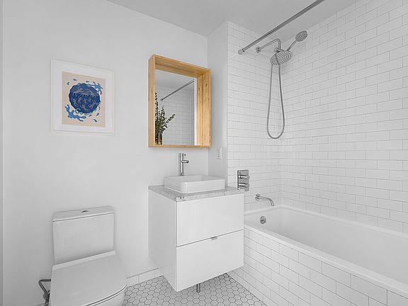 The open-concept layout seamlessly connects the living area both to the kitchen and to your over-sized balcony, optimizing the space for entertaining. The open chef's kitchen is equipped with stainless steel appliances, elegant Caesarstone countertops, and breakfast bar. You'll love your private balcony, ideal for enjoying morning coffee or unwinding at the end of the day. The king-sized bedroom serves as a peaceful retreat, offering ample space for relaxation. Its large three panel window allows spectacular light into this room as well. The spa-like, Scandinavian-inspired bathroom has a deep soaking tub, rainfall shower, and Carrara white marble vanity. 651 New York Avenue is a new boutique condo building with elevator access and a fully-equipped gym, in the heart of Wingate/Prospect Lefferts Gardens. Just five minutes from the 2 & 5 subway lines, making transportation easy. Tax Abatement until 2032! * Assessment of $247.37/month ends March 1, 2025