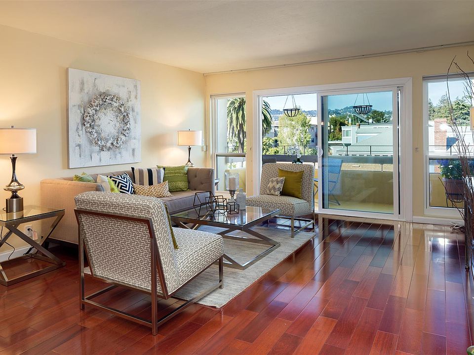 GORGEOUS, SPACIOUS and SUNNY top floor, 1082 sqft, 2 bedoorm, 2 bath Condo with stunning hill views. Completely remodeled kitchen, updated baths, cherry hardwood floors and fresh paint. Large master suite with large closet space. Open floor plan for gracious entertaining with large dining and living room that leads to balcony with a view. Close to shops, cafes, restaurants, and theaters. Walk to casual commute to city or short drive to BART and easy access to freeway. Move-in condition!