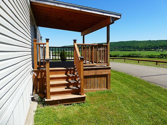 If peace and quiet are what you are looking for, this is where you will want to be! This 2 bedroom 2 bath home sits on a corner lot overlooking the community garden and Western New York farmland. This is one of the area's most sought-after mobile home parks with no barking dogs as your neighbor. You can sit on a newly built covered deck and watch your garden grow. A 2 bedroom, 2 bath split floor plan is ideal for a single person who needs an office to work from home. Luxury vinyl plank flooring throughout. All appliances stay including the washer & Dryer. This home also features a new sliding patio door which is rarely found in mobile homes. Located in Pine Knoll Park, Rt. 961F. Cash Only. Send your highest and best offer today!