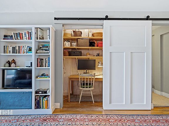 The windowed, eat-in-kitchen is a cook’s dream boasting custom cherry wood cabinets, granite countertops, and high-end appliances, including a Wolf range, Bosch dishwasher, and 36” LG double-door refrigerator. The renovated bath has a soaking tub, classic subway tiles, and a pedestal sink. The corner bedroom has ample room for a king-size bed. Currently utilized as a two-bedroom, the alternate floor plan shows the easy formal conversion possibility. With the added bonus of a functional home office, this is the perfect place to call home.