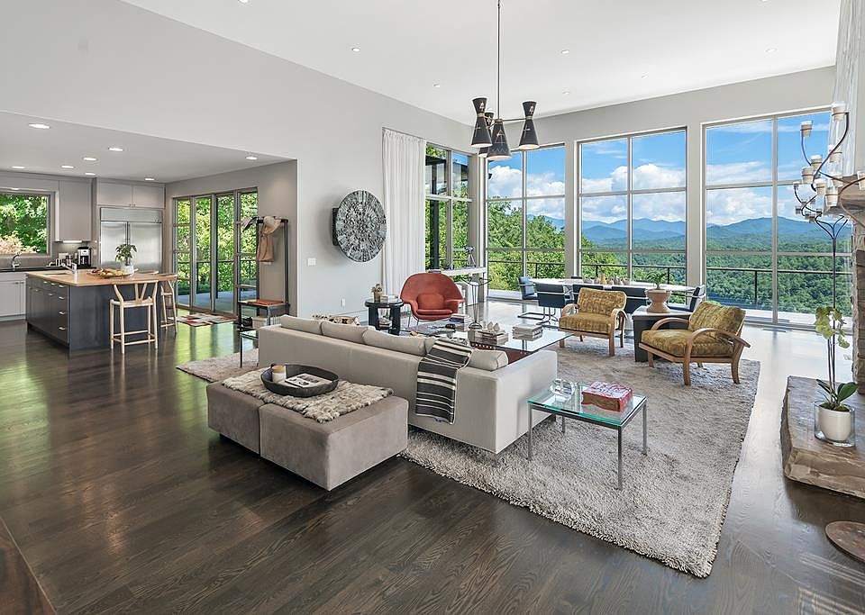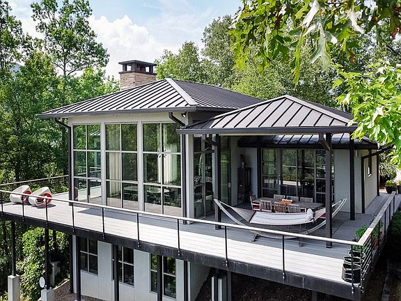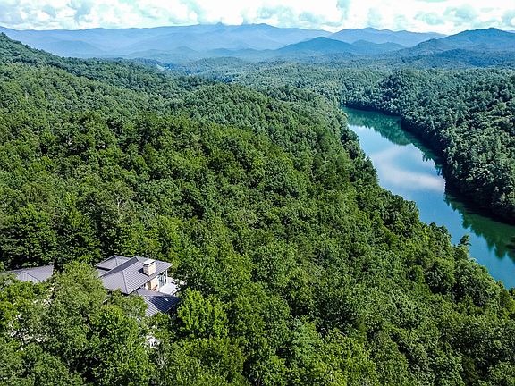 Cantilevered over a ridge with stunning views overlooking Lake Fontana/Nantahala River & the Nat'l Park, this magnificent contemporary home has a Japanese design motif, featuring a series of interlocking spaces with standing-seam metal roofs. The designer had previous homes featured in Town & Country, NY Times & many intern'l books & mags. A Trex deck surrounds the house with a metal railing system topped with Ipe wood. Atrium with a Popcorn Sutton still. Covered outdoor dining. Interior features: wide plank walnut floors, custom cabinetry, black granite, island topped with butcher block, a 2nd prep sink, walk-in pantry, GE Monogram stainless steel, pro grade appliances incl 6-burner gas stove & double refrigerator. Spacious living area has floor-to-soaring-ceiling encased glass, stack stone FP & vintage chandelier sourced from a church in Quebec. Spacious ensuite master on main with built-in floor-to-ceiling bookcases, wall of windows overlooking the Lake, double sinks, Carrera marble, soaking tub, shower, walk-in closet with hook-ups for a 2nd laundry. Downstairs: 2nd ensuite Master, massive game room with wet bar, fridge, fireplace, 4th BR, laundry. Gardens, carport. AMAZING!!