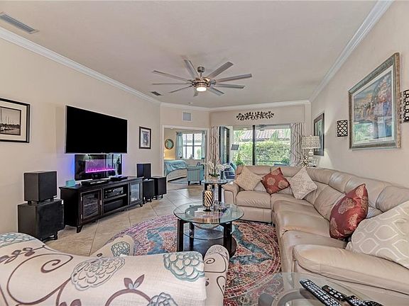 Welcome home to River Strand! This beautiful maintenance ???free villa offers 2 bedrooms, 2 bathrooms, den, and two car garage. The villa has partial water views with lots of privacy! The kitchen boasts granite counter tops, custom back splash, wood cabinets, stainless steel appliances, breakfast bar and pantry. The adjacent dining and great room are perfect for entertaining or a night of relaxation at home. The spacious master suite has two large closets, bathroom with dual sinks, a large soaking tub and separate shower. The outdoor living space is sure to impress with extended paver lanai and view of the lake. Gorgeous upgrades throughout include tile floors in living areas, crown molding, designer light fixtures and fans, and a custom cellular shade on sliding doors make this home a must see! This villa comes with a social membership that entitles you to free use of both fitness centers with separate aerobics room, 8 HAR-TRU lighted tennis courts and an on-site tennis pro, pickle ball, two resort style pools, a swim resistance pool, billiard room and more. Grab a drink at the pool-side tiki bar or meet your neighbors at the wonderful restaurant in the Tuscan inspired clubhouse. An active social calendar awaits you to enjoy. This community is within 1 mile of I-75 which makes commuting to St. Pete, Tampa, or Sarasota a breeze. Furniture is negotiable on separate bill of sale. Dining room light/fan fixture does not convey.