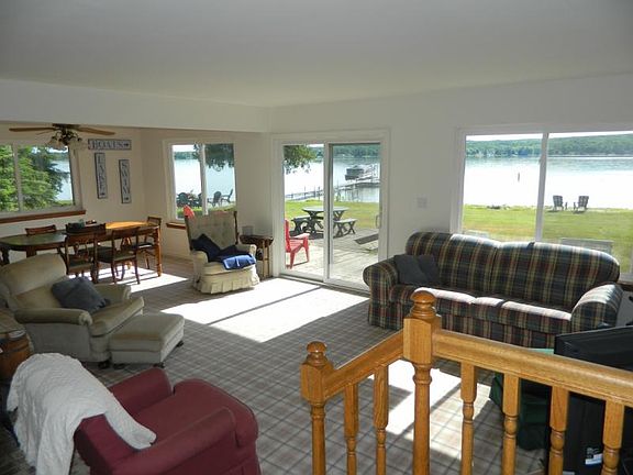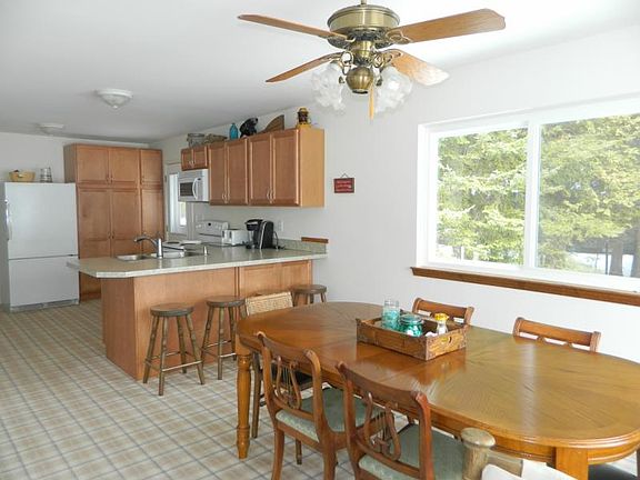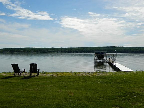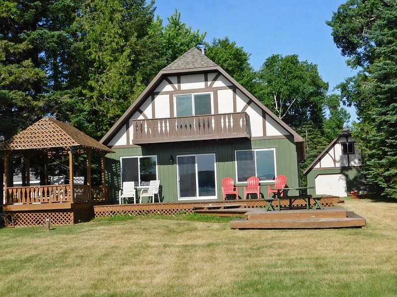 Chalet on 75' prime sand, level to waters edge beachfront. 4 bedrooms, 1 1/2 bath, open dining, kitchen and living area with wood stove mounted on brick harth. 6' glass door wall entering lakeside and walk around deck or sit in the gazebo enjoying your favorite beverage or watching the sunrises. There are two bedrooms and laundry on the main level and 2 bedrooms, loft area and 1/2 bath on the second level. The detached drive through two car garage has an unfinished storage area above. Asphalt drive. Move in ready!