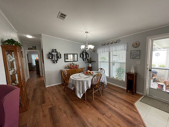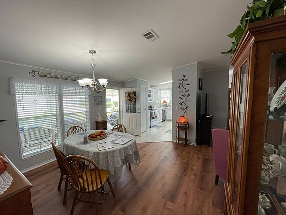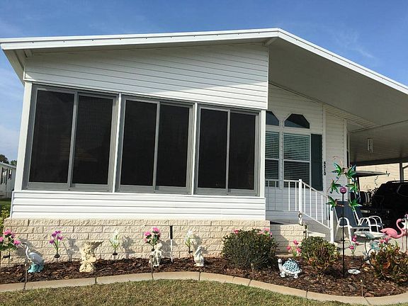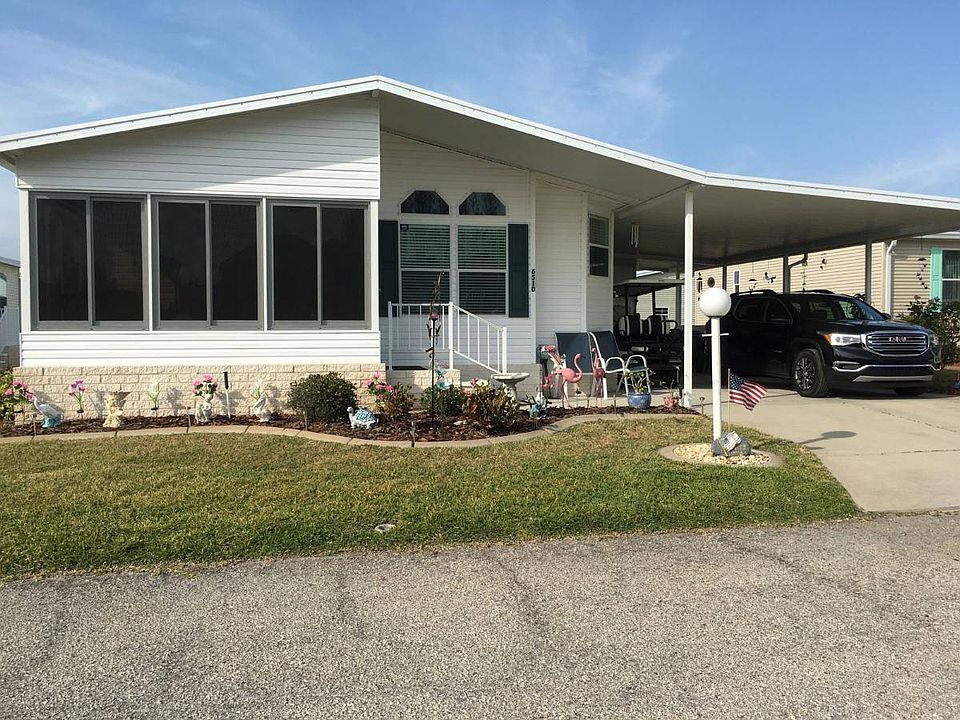 This is a mobile home for sale in a gated, pet friendly, 55+ community on a rented/leased lot. This 2BR/2BA 2000 Palm Harbor is 1,400+ square feet and has ample room for living, dining and entertaining. All of the appliances are included in the sale. The home comes partially furnished/turnkey. There is a 2018 shingled roof and 2019 A/C to keep it all cool. This home is an open living room/dining room combination with sheetrock walls, ceiling fans and vaulted ceilings. The living room opens to a 10 x 13 ceramic tile floor lanai enclosed with screen/acrylic slider windows. The kitchen is a light, bright, Chef's delight with updated 2019 stainless appliances, fresh paint, resurfaced cabinets with new hardware and refinished epoxy countertops. There are plenty of cabinets, cupboard space and a food pantry. The formal dining area has vinyl plank flooring, sheetrock walls and vaulted ceilings The living room has vinyl plank flooring, sheetrock walls and vaulted ceilings. The master bedroom has vinyl plank flooring, ceiling fan and a walk-in closet. The master bathroom features 12" ceramic tile, updated high top toilet, linen closet, dual sinks with upgraded countertops and a walk in shower. The guest bedroom has vinyl plank flooring, a ceiling fan, sheetrock walls and a closet. The guest bathroom features 12" ceramic tile flooring, a single sink vanity and a tub/shower combination. There is a closet that houses the 2019 washer/dryer (included in the sale). The carport can park 2 cars tandem style. There is a shed for additional storage. There is a landscaped yard for great curb appeal. The lot rent is ~$842 a month and includes lawn mowing, edging and blowing and all the community amenities below. Ridgewood Estates features 24/7 guard gate, 2 Clubhouses; 2 Pools; Hot tub; Shuffleboard & Tennis court; Library; Billiards Room, Work out room, with a 7 day calendar of events to take part in. Come join in the Fun!