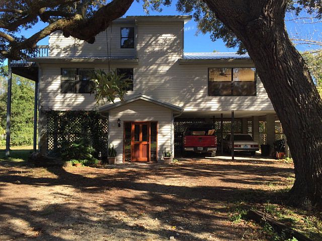 Tree shaded 2 story stilt home on desirable Riverside Drive. Many new upgrades since 2013 including a metal roof, modern master bath, custom built bar, built in mahogany desk and bookshelves, new Oak stairs, bamboo flooring on second floor, entry wainscoting of reclaimed cypress. The new kitchen has solid wood custom cabinets of deadhead cypress from the Withlacootchee River. This is a unique home of modern design mixed with fine custom woodwork with a rustic flair. 3 marinas within 3 blocks and a free boat ramp. Large fenced corner lo