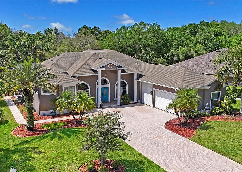 Luxury, Privacy, Location! This beautiful custom built home has it all. 6 bedrooms and 3 ½ baths. Almost an acre in an upscale, gated neighborhood. Stylish front home entrance with beautiful columns, porch and double doors. Enter into a foyer with high ceilings and a stunning open plan home just made for entertaining. Living room with gas fireplace, formal dining room with tray ceiling and chandelier has it's own beautiful columns at the entrance. A bar area opens right into the family room and incredible kitchen. It has an oversized island and separate breakfast bar with gorgeous granite countertops. There are more cabinets than you can fill and top of the line appliances. Beyond the family room are four bedrooms. Two of them are connected by a Jack and Jill full shared bath. One of them is large enough to be a game room and opens to the pool area. Another full bath with shower is in the hallway and can be accessed from the pool area. The Primary bedroom is very large and opens to the pool area. It has double walk in closets leading to a spacious bathroom with a garden tub, oversized glass block shower and separate vanities. Upstairs there is another bedroom with a half bath and a terrace looking out at the conservation view. The pool area is ready for a family get together with a spa, an outdoor kitchen area and plenty of deck space. There are three large fans in the pool area for added comfort. It overlooks the conservation area as well. The backyard has a mature shade tree and a grassy area for family picnics. Like cars? This home has a 3 car garage with epoxy floors, room for a fourth car or golfcart, and a workroom. The garage has windows at the front of the house. This home is on a large cul de sac where bikes can be ridden and strollers can be pushed. There are special custom touches everywhere, tray ceilings, decorator ceiling fans, art and plant areas in walls, arches and high ceilings throughout, so many accent windows, specialty lighting, ring doorbell, sprinkler system on a well, wind rated glass, security system and beautiful paver driveway. You will love the lighted landscaping. Riverside estates is a lovely, quiet neighborhood with a meticulously landscaped gate and large lots. Easy commute to Tampa or Clearwater and access to all the things you want to do. Go to the beach, boating, St Pete Pier, Tampa shows and concerts, Tarpon Springs Sponge Docks, restaurants, shopping and airport. You will love your lifestyle in this magnificent home.
