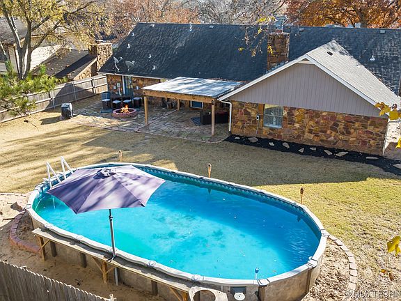 This lovely residence boasts four spacious bedrooms, two and a half beautiful bathrooms, making it a perfect fit for your growing family. There is great flex space for an office or additional living. The kitchen features a counter height bar, eat-in dining and attached formal dining, with easy access to the living room and provides a great flow to host multiple guests or large family. Come relax in the beautiful outdoors under the arbor covered stone patio and sitting area with firepit. Bringing the beach to you, the pool area features a sandy beach with tropical plants, additional bar and seating behind the pool. Saving the best for last, the main suite comes with a separate tub and shower, as well as multiple closets for ample storage, a sitting area and access to the back patio. Nestled in South Tulsa, this home offers easy access to plenty of shopping, dining, and entertainment options.