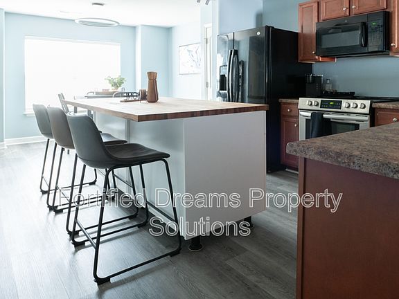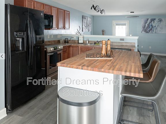 Step into this inviting space, and open floor plan! Where the kitchen's dining table and island offer abundant seating. The thoughtfully updated kitchen, featuring all-new appliances, is perfect for culinary enthusiasts. A convenient half bath is just steps away. Transitioning from the kitchen, you'll find a cozy living room with brand-new sofas and a large flat-screen TV for all your streaming needs. Upstairs, (15steps) discover two spacious bedrooms, two full baths, and a laundry room for your convenience. The kitchen is fully equipped with a range of pots, pans, and utensils to enhance your cooking experience. Relax on the charming patio and enjoy the fenced-in back patio with a stone fire pit. Plus, enjoy the convenience of two parking spots right in front. Welcome to your perfect home away from home! Amenities: heat, air conditioning, appliances, electric stove, oven, microwave, toaster, refridgerator, keurig, fenced backyard, washer & dryer, first time use essentials, dishwasher, fire pit, outdoor seating, flat screen tv in every room, 1 queen bedroom, 1 double bedroom, dining table, kitchen island, cookware and utensils