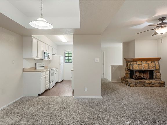 Ideal Location in Tulsa! This Shadow Mountain Condo presents a delightful 1-bedroom, 1-bathroom home that's ready for you to move right in. Situated upstairs, this unit boasts a welcoming & cozy gas fireplace, an open airy floor plan, a generously sized bedroom with a spacious walk in closet, and an enclosed patio that can serve as the perfect office or hobby room, complete with an additional storage closet. Enjoy the amenities of this community, including TWO swimming pools, a club house, covered parking, and the convenience of included HOA services such as trash, water/sewer, exterior maintenance, and gated access. Embrace a turnkey, low-maintenance lifestyle in this charming space, which includes a brand-new microwave and freshly shampooed carpets just waiting for its new owner to move in! Schedule a tour today to experience the appeal of this conveniently located Tulsa condo firsthand