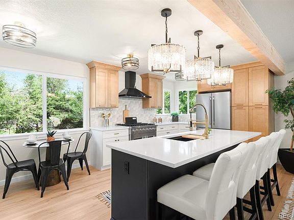 Where Modern Design Meets Intentional Living — Just Minutes from Olde Town Arvada. Step into a beautifully reimagined home where every detail has been curated for comfort, style, and function. Fully updated from top to bottom—including new roof, furnace, central A/C, windows, plumbing, and electrical—this home is turn-key and future-ready. Natural light pours through updated windows, highlighting the warmth of real hardwood floors and the richness of custom cabinetry throughout. The kitchen is a showstopper, featuring a large central island perfect for entertaining, a 36-inch gas range with French door oven, sleek quartz countertops, and eye-catching brass hardware. Thoughtfully integrated wood beam accents add warmth and architectural character, giving the space a grounded yet elevated feel. Stylish light fixtures and designer tile selections throughout the home reflect a modern aesthetic that feels both fresh and timeless. The bathrooms offer spa-like finishes, dual vanities, and bold touches like black and gold fixtures, custom mirrors, and tiled shower niches. Every inch of this home was designed with intention—from smart storage solutions to maximizing usable space in every room. Downstairs, discover a fully finished basement with its own private entrance and dedicated driveway, making it ideal for a home office, guest suite, or income-generating rental opportunity. Tucked in a quiet neighborhood with mature trees and easy access to I-70, this home offers the best of both worlds: quick commutes to downtown Denver, mountain getaways just up the road, and walkable access to the shops, restaurants, and charm of Olde Town Arvada and the nearby light rail station. Whether you're hosting friends for a weekend dinner party or heading to the mountains on a whim, this home is designed to keep up with your lifestyle—and inspire it.
