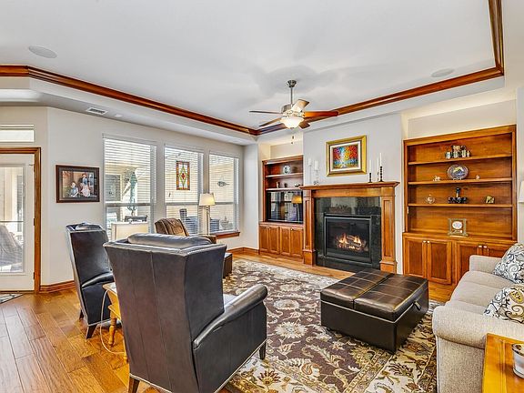 Amazing zero entry patio home in very desirable Estancia Courtyard Home community! This home has a 3rd car garage, which is not as common with patio homes and provides lots of extra storage and parking options. This split bedroom home has lots of included upgrades! The custom kitchen has gas range, high end cabinets, lots of storage, large walk in pantry and all kitchen appliances including refrigerator included. The living room is oversized and has custom built in cabinetry beside the gas fireplace and built in speakers with sound system. All main spaces are engineered wood floor with upgraded carpeting in the bedrooms. The den/office off the dining space provides a great extra room that can be a once in a while 3rd bedroom, separate TV room, or grandkids playroom. There is also a sitting room off the large master bedroom that also can be an office, workout space, or living space. The master bath has the custom zero entry walk in shower and large walk in closet. This home has custom blinds already included in the home. The courtyard of this home has fantastic privacy and very nicely kept landscaping with stepping stones to additional patio space behind the home with large patio umbrella included. The home has eastern and northern outdoor exposure giving great options for being outdoors and has views of the water ways and fountain behind the home. The oversize 3car garage has space for storage and a future storm shelter if owner would like to add one. The Courtyards at Estancia community provides lots of opportunity for social activities with the community clubhouse, outdoor heated pool, and pickleball courts. With 134 homes within the patio home community, there are lots of great neighbors that can become an extended family/friend network!