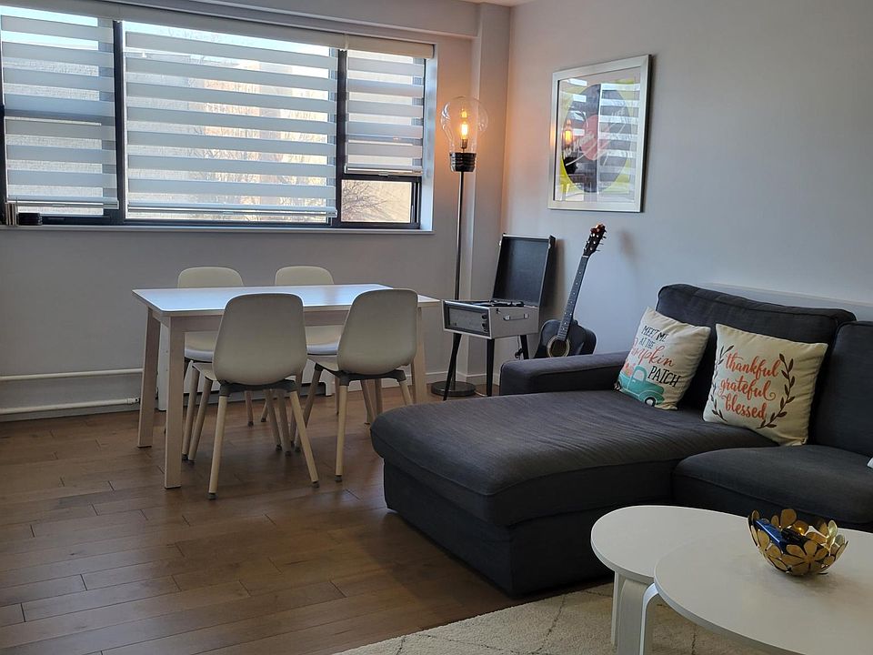Recently completely renovated unit on 4th floor. Brand new modern style kitchen and bathroom with heated floors ! Beautiful hardwood floors throughout the unit, all new doors, moldings and hardware. Large bedroom will fit king size bed and oversized closets will fit all your clothes. Bright and sunny living room with access to open kitchen gives modern style look and plenty of space for table and 6 chairs, L shape sofa, computer desk and more. Laundry on site, access to gym and doorman 24/7. Possible to rent parking spot for additional $250. No pets, no smoking of any kind. Heat & water included. Tenant pays electricity.