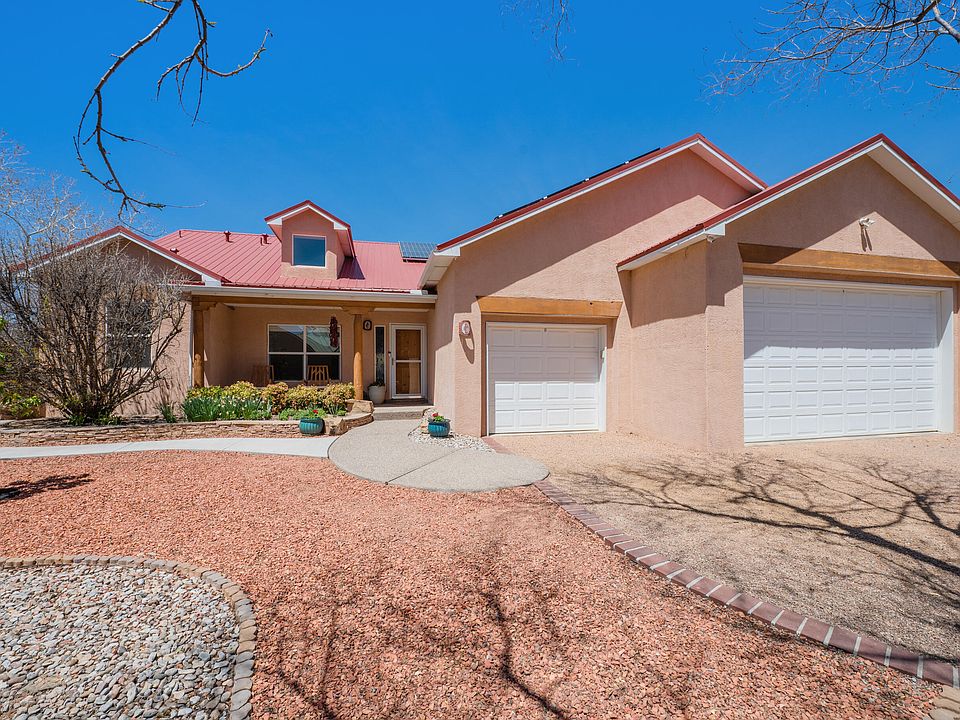 Welcome Home! This gorgeous single-level home in Bosque del Rio has it all!! Bright and open floor plan with cathedral ceilings!! Beautiful kitchen with executive cabinets, granite countertops and stainless steel appliances!! Updated luxury vinyl flooring throughout!! Master suite is large with its own door to the back patio, bathroom has double sinks, huge closet, and a large free standing tub!! Backyard is peaceful with a covered patio and garden beds, with rain barrels!! Dreamy 3-car garage is 950 sf with its own evap cooler, 9 ft doors on the double side, tons of storage shelving and epoxy floors!! Metal roof with seamless gutters and owned solar!!
