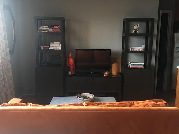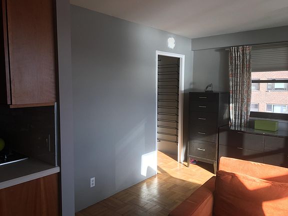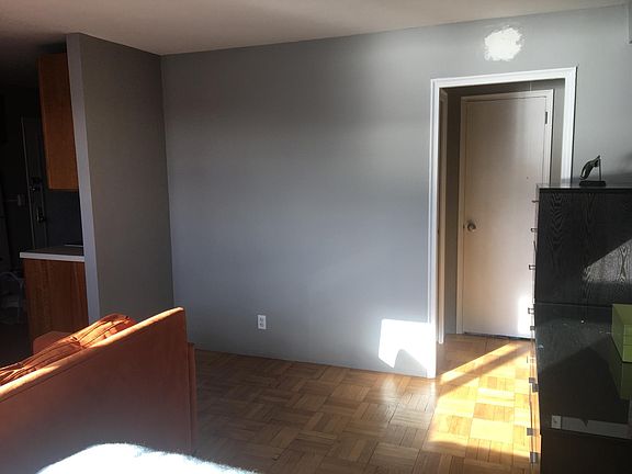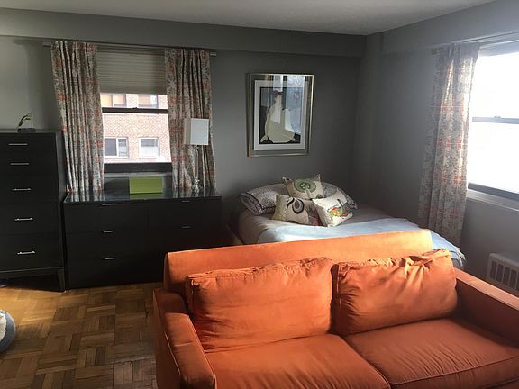 Furnished studio apartment (except the couch) with NYC views in a doorman building with gym, laundry room and easy commute to NYC. Located on desirable JFK BLvd East within walking distance of parks, restaurants, coffee shops and supermarkets. NJ Transit and NY/NJ Waterway Ferry bus stop in front of the building. Seriously, this place is a commuters dream. $1600 per month. First and last months rent due at signing. $500 move-in fee Heat and hot water included