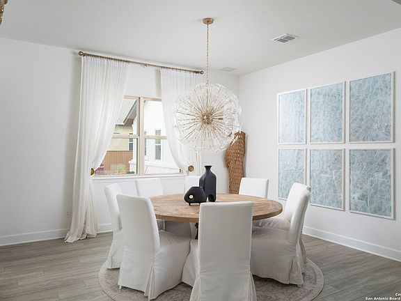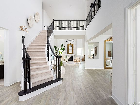 Welcome to this stunning Mediterranean-inspired home, reminiscent of the beautiful aesthetics of Santorini. Conveniently located near Randolph Air Force Base and just 20 minutes from Fort Sam Houston, this property offers a perfect blend of elegance and practicality.Situated on an expansive lot spanning over 1/2 an acre, this home welcomes you with a captivating semi-circular front driveway and a meticulously designed biodesign swimming pool imported from Italy, creating a private oasis in the backyard. For added security and exclusivity, a remote-controlled custom iron gated side entry leads to the three-car garage and an open courtyard that can accommodate two additional vehicles. Step through the magnificent 8ft double wrought iron doors into a grand foyer with soaring 20 ft ceilings and a gracefully curved staircase. The open floor plan of the main house encompasses five bedrooms, four full bathrooms, an office, formal dining area, breakfast nook, game room, media room, and a convenient mudroom. Additionally, the fifth bedroom has been thoughtfully converted into a home gym, offering flexibility to suit your needs. The living room is adorned with a floor-to-ceiling rock facade fireplace, creating a cozy and inviting atmosphere. The spacious kitchen is a culinary enthusiast's dream, boasting exquisite upgrades, including exotic granite countertops and top-of-the-line built-in appliances. The master bedroom retreat features a generous walk-in custom closet and a spa-like bathroom, providing a tranquil haven for relaxation.Throughout the first floor, you'll find low-maintenance luxury vinyl plank flooring, while the bathrooms showcase elegant porcelain tiles. The arched porte cochere seamlessly connects the main house to the Casita, providing a separate entry and ensuring privacy between the two spaces. The Casita offers a comfortable living room, a well-appointed kitchen, a restful bedroom, a full bathroom, and a walk-in closet.This extraordinary property combines architectural charm, impeccable design, and modern amenities to create a truly captivating home. Don't miss the opportunity to experience the allure and sophistication of this Mediterranean gem.