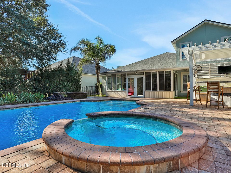 Wow! 5 BR/3BA pool home in amenity-rich Bartram Springs! The home has a private outdoor area with large custom pool, heated spa, pergola, kitchen and sun deck. Recent updates include new roof (2022), 4 ton a/c compressor (2023), new kitchen cabinets and countertops, new double front door with plantation shutters, new dishwasher and microwave (2022) and water heater. Features include wood floors, open floor plan, plantation shutters and close proximity to the highly-rated Bartram Springs Elementary School. The large glass-enclosed back porch is not included in the listed square footage (not under air), but provides extra living space for much of the year. If you aren't familiar with the amenities in this established neighborhood, be sure to look at the photos in the listing.