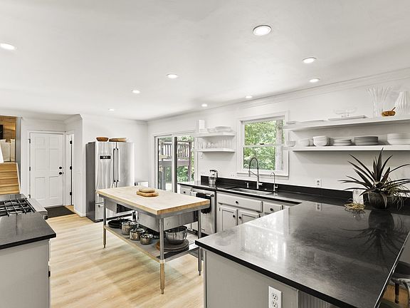 Rustic meets elegant on these 5 gorgeous private wooded acres with gated entrance (fully fenced to let your dogs roam). Magical mature trees surround the rustic cedar sided home. Recently renovated elegant interior features a large kitchen with Thor stainless steel appliances, black granite countertops, stainless steel farm sink, gray lower cabinets and floating upper shelves, butcher block stainless island, and a fantastic view of your backyard retreat from the window over the sink. Huge den has vaulted ceilings, wood burning fireplace, wet bar, and a balcony deck overlooking the backyard. Primary bedroom downstairs, two large bedrooms upstairs, side entrance two car garage, 4 car carport, storage shed, covered rocking chair front porch, large patio off the kitchen. New flooring and fresh paint throughout.