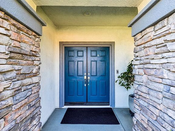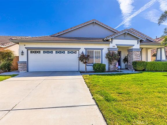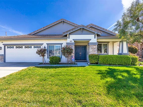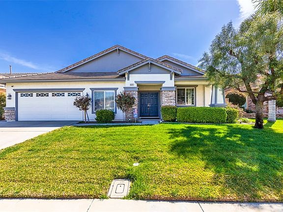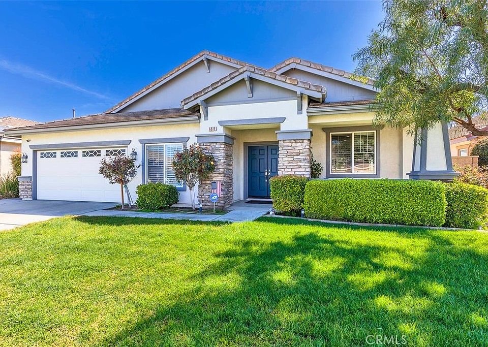 HURRY...Sellers are motivated!! Here is your chance to own this well-appointed Eastvale home located on a quiet cut de sac in the Steeplechase development. This Craftsman influenced single-story home has outstanding curb appeal, and definitely shows pride of ownership throughout. From the well-manicured landscaping in the front and back yards, to the tasteful and newer upgrades inside, you will not be disappointed. As you pass by the inviting front porch, you enter the home thru the double door entry. To your right is the large Living Room/Dining combination, featuring Crown Moulding and upgraded baseboards, and that has recently been upgraded with "wood-like" heavy-duty vinyl flooring (You will also find Plantation Shutters throughout the entire home). To your left, and through a set of double French Doors, is a large office (which could easily be converted to a 5th bdrm). The open floor plan then leads you into the huge Kitchen/Family Room, featuring custom tile flooring and Crown Moulding. The Kitchen is an entertainer's delight, with top quality built-in appliances (and a new dishwasher) as well as a ton of counter, island, preparation and serving space. Perfect for hosting those huge dinner parties or gatherings. The granite counters have recently been added, and the cabinets have recently been glazed dark brown, while the island was done in antique white and a black epoxy resin Farm sink was also installed. All of the cabinets and drawers in the Kitchen are "soft closing". The Family Room features recessed lighting, ceiling fan, built-in cabinetry and bookshelves, and leads out to the covered patio which includes two ceiling fans of its own, recessed lighting and handsome concrete work. The private backyard is fully landscaped, with a lush lawn and numerous mature plantings. The main bedroom is separated from the other 3 bdrms by the Family Room, making for great privacy. It features a bathroom with two sinks and separate tub and shower, and these cabinets have also recently been redone in antique white. You will find the other 3 bdrms and full bath on the other side of the home. For add'l savings, the home has leased Solar Panels, which greatly diminish the overall monthly electric bill, and the exterior of the home was recently painted with thermal barrier paint, further increasing the insulation factor of the home. Located a short distance from restaurants, shopping and excellent schools, this home is a must see!