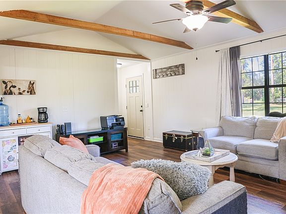 Escape to your own private sanctuary on this charming, 1.86 acre property that perfectly blends comfort with countryside tranquility. From the white picket fence to the front porch swing, this cute 3 bedroom 2 bath home oozes country living. The home has been renovated in the last few years and features an open floor plan and a nice sized kitchen with stainless steel appliances. The living room has a cozy wood-burning fireplace and a beamed ceilings for that rustic feel. Home has a metal roof and septic system has a new drain field. It even comes complete with your little red barn chicken coop!!