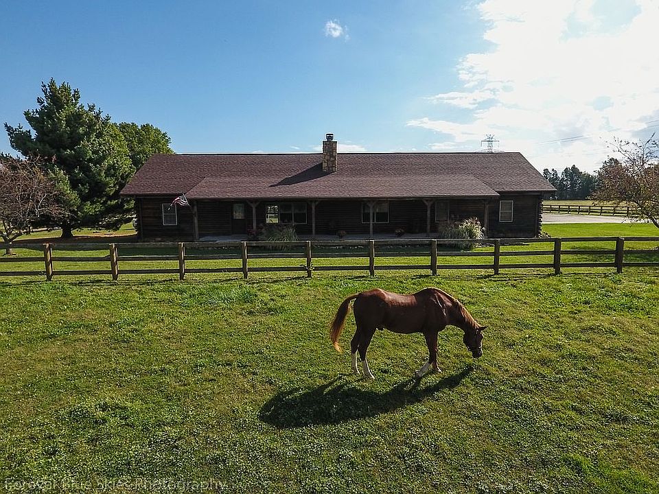Absolutely stunning custom built log home with a 10 stall horse barn on 5 acres just minutes from New Albany and Hoover Dam. Barn features 10 stalls, newer roof, private office ,tack room. Home has great room with upper loft and first floor master suite with double sided fireplace to living area. Updated flooring throughout. Property completely fenced and covered front porch overlooking beautiful pastures.