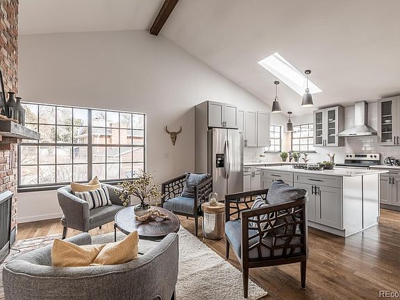 A True Original in this Fully Renovated Scenic Heights Masterpiece. Hilltop Raised Ranch Custom Built Decades Ago and Re-imagined with Recent Remodel. Vaulted Ceilings and Wood Beams Perfectly Accent Floor to Ceiling Exposed Brick. Sunlight Floods Upper Level Through Ample Windows and Plentiful Skylights. All New Richly Stained Hardwood Floors. Charcoal-Hued Windows and Ledges. Rustic Modern Touches Around Every Corner Including Hand-Picked Light Fixtures in Deep Bronze with Brass Accents. Striking Gas Fireplace with Brick Surround. Great Room Encompasses Living Area, Dining Area off Rear Patio & Open Concept Kitchen. Grey Shaker Cabinets, Marble Counter Tops and Center Island - Perfect for Entertaining. Expansive, Vaulted Master Suite w/ Subway-Accented Four Piece Bath. Two Additional Bedrooms w/ Accompanying Full Bath. Main Floor Also Boasts a Tucked Away Office/Den with West Facing Windows. The Walk Out Lower Level Adds Oversized Family & Gaming Areas with Plush Carpet. You'll Also Find an Additional 3/4 Bath Plus a Large Hobby / Mud Room and a Spacious Laundry Room - All with Easy Access to the Two Car Garage and Rear Yard. Brand New Interior and Exterior Paint. Newer Roof and Mechanicals. Central A/C. Fully Landscaped, Sprinklered Lot with Fence Surround. Perfect Proximity to Historic Olde Town Arvada. Easy I-70 Corridor Commute or into Denver or Boulder. Near Trails, Parks and Easy Access to Schools.
