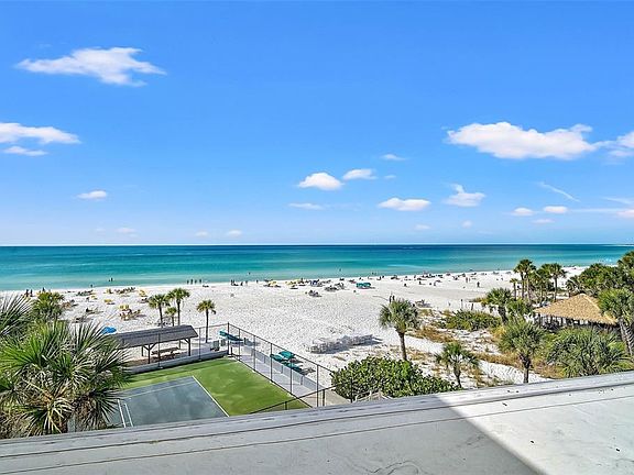 Rarely available 4th-floor residence in the highly desirable and impeccably managed House of the Sun on Siesta Key. Ideally positioned far forward on the South side of the building, this unit enjoys some of the best Gulf and beach views currently available, with sweeping vistas of the Gulf of Mexico and Siesta Key’s world-famous white sand beach from both the living room and the lanai. Adding to the appeal are the two popular sun decks located on the ends of the 4th and 5th floors. House of the Sun offers 100 feet of direct beachfront and an exceptional location just 500 feet south of the Stickney Point Bridge, providing quick and convenient access to and from the mainland. The property is within walking distance to an outstanding selection of restaurants, clubs, and everyday conveniences, including gourmet food and fish markets, coffee and ice cream shops, liquor store, boutiques, salons, postal and shipping services, and beach, sport, and boat rentals. Local favorites such as Captain Curt’s and Daiquiri Deck are just steps away. This residence has seen significant recent updates, including hurricane-impact sliding glass doors and bedroom windows. The owner has spared no expense, and this may be one of the nicest units in the building. The kitchen features granite countertops and stainless appliances and offers the rare convenience of dual entry points into the dinette. Additional highlights include custom built-ins in the hallway, an expanded primary bath with a large granite vanity and dual sinks, and custom cabinetry in the primary bedroom for added storage and functionality. House of the Sun has also completed extensive common-area improvements (2024–2025), including new elevators, a new hurricane-impact roof, updated pool and tennis court, an enhanced poolside common room with new exercise equipment, new gas grill stations, refreshed outdoor seating areas, updated landscaping, hallway paint, carpet, lighting, and upgraded Wi-Fi throughout the building. The complex is pet-friendly for owners and is widely regarded as having one of the best on-site rental programs on Siesta Key, featuring a three-night minimum rental policy. This unit performs well in the rental pool and offers an excellent balance of personal enjoyment and rental income potential. Sale subject to future bookings