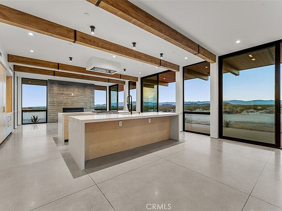 Welcome to your high desert modern meets organic masterpiece that seamlessly blends luxury with the rugged beauty of the surroundings. This exquisite property, sprawled across 5 acres with incredible panoramic views adjacent BLM land to the south and west. As you step through the impressive 10-foot Arcadia pivot front door, you are greeted by a flood of natural light, courtesy of the 10-foot custom glass windows crafted by Westhershield. The interior features elegant polished concrete floors, and a 65-foot concrete form board wall with a wood grain pattern that artfully separates living spaces from the bedrooms and bathrooms. The beautiful kitchen dual Caesarstone organic white quartz islands, custom kitchen cabinets crafted on-site, and top-of-the-line appliances including a Dacor range, Fisher & Paykel panel-less fridge, and dishwasher. The living room features a gas fireplace framed by concrete form board, creating a warm, elegant and inviting ambiance. Every detail of this home is meticulously designed, from the kiln-dried spruce wood exterior, exquisite polished concrete floors, to the black metal Westhershield custom glass windows. Enjoy the detached garage, fully equipped with main electrical, main water, and propane gas. Enjoy the luxury of environmentally conscious living with a tankless water heater, solar panels, and a battery system fully paid for. The rear of the home faces south, ensuring breathtaking views of Joshua Tree National Park are always within sight. Indulge in relaxation in the custom-made vanities, free-standing tub and beautiful Bedrosian tile in the bathrooms. The skylights in the office/study area illuminate the space with natural light. Secluded on your own 5-acre retreat, you'll experience the tranquility of high desert living while still being conveniently close to town and the national park. With utilities in place, the property is ready for a pool installation! Steel beams wrapped in luxurious thermally modified pinewood are cantilevered out create a 10 ft overhang on the south side of the house and an 8 foot overhang the east side of the house, in which allows for a covered patio space perfect for watching sunsets and sunrises or entertaining. Embrace the opportunity to own a truly unique and high-end property, where the marriage of luxury and organic materials creates a modern masterpiece perched above Joshua Tree National Park. . The property has been approved for a short term rental permit, and will be issued shortly