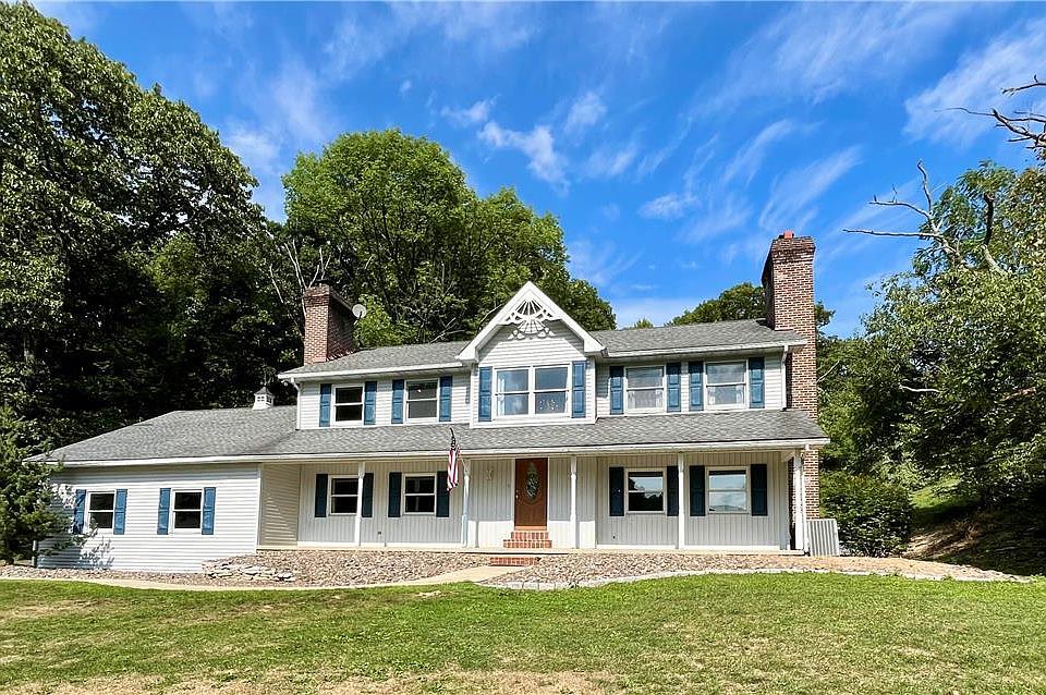 Nestled in the serene countryside, privacy abounds this lovely Farmhouse style 4BR 2.5 bath home with a 3 car garage on 7 acres. The inviting covered front porch leads to a bright tiled foyer. The first floor features a living room with a wood mantel gas fireplace and dining room with red oak hardwood floors. The kitchen boasts cherry cabinets, granite countertops, a tile backsplash and LVP flooring. The family room features double pocket doors and a wood burning brick fireplace. A half bath and laundry room complete the first floor. The second level offers a master bedroom with a walk in closet, an en-suite bath with a jacuzzi tub and separate shower. Three additional bedrooms and a hall bath. Outdoor entertaining areas feature 2 spacious Trex decks. There is also a 3 bay detached garage (30'x40') with 9'x10' garage doors. It's a great space for a work shop and all your winter and summer toys. This beautiful property offers endless possibilities for gardening, recreational areas, or simply enjoying the wide-open space. Make your appointment today to see this charming home that combines space and comfort with a touch of country charm.