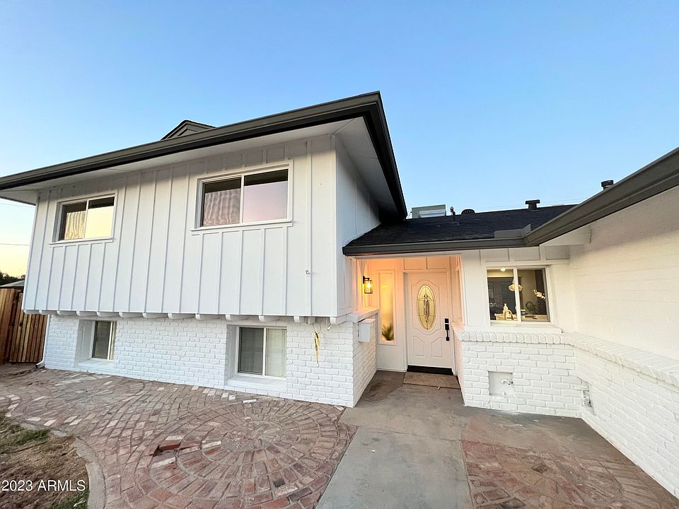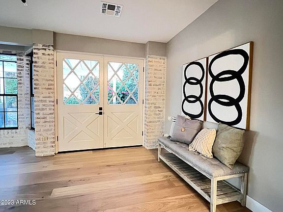 Beautiful Modern Farm split level remodel and fully designed home with 5 bedrooms 3.5 baths with a extended living area off the back of the home with an open floor plan and a split level plan that includes 3 beds and bath upstairs and a tv/living room bedroom, laundry and full bath downstairs with access to back yard. new pool and landscape underway and will be completed prior to close of escrow with new front door also. lots of hardscape pavers and lots of new grass/sod to come with front and back auto watering and sprinklers. access to canal to ride your bike or jog right into Old Town Scottsdale. Large yard great outdoor living!!