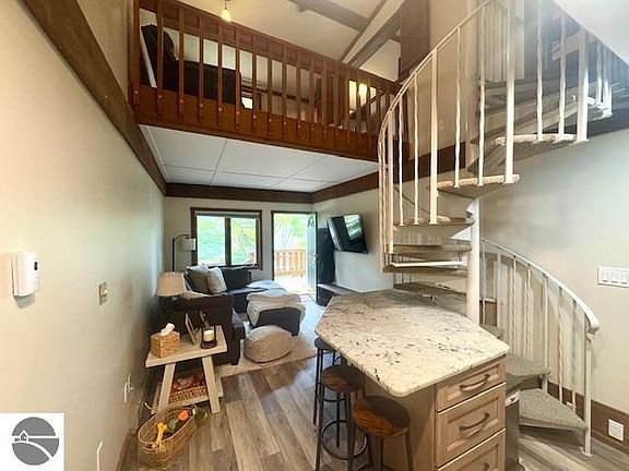 Beautiful 2-bedroom, 2-bath condo located just steps from the base of the ski hill at Schuss Mountain in Mancelona. This fully furnished unit offers a perfect retreat for year-round recreation and relaxation. Recently renovated kitchen. Enjoy the convenience of short-term rentals, making it an excellent investment opportunity. The condo is also conveniently situated near the golf course, providing ample outdoor activities. Don't miss your chance to own this ideally located mountain getaway! Dues include: water, sewer, trash, snow removal, lawn care and exterior maintenance