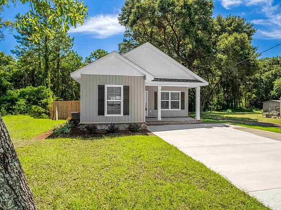 Brand New Home, Ready to Move In! Begin your mornings savoring coffee on your kitchen-adjacent covered porch and end the evenings sipping on Ice Cold Tea from your Front Porch. The expansive kitchen boasts ample counter space, soft-close drawers and cabinets, a built-in desk, stainless steel appliances, and two Lazy Susan cabinets. Revel in the elegance of 9-foot ceilings, pendant and recessed lighting, and stylish luxury vinyl plank flooring. Benefit from impact-resistant windows and a dedicated storage room. Only 15 mins to Johnson Beach in Perdido Key and 20 mins from Pensacola Beach and the Gulf! Conveniently located near Naval Air Station Pensacola.
