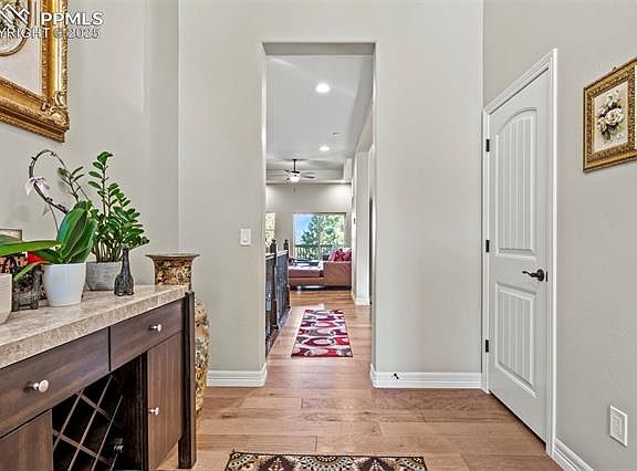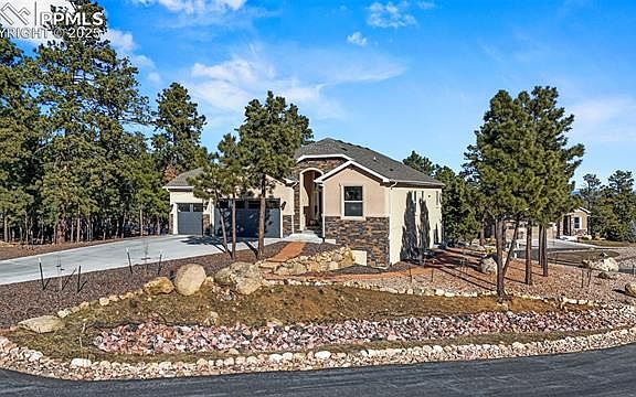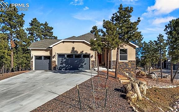 Perched among the trees on a walk-out, cul-de-sac lot in the gated Star Ranch community, this ranch style home offers stunning views in every direction. Built in 2021, this stucco and stone home is situated above the other lots, on nearly a half acre at the base of Cheyenne Mountain. The highlights of this ranch floor plan include formal foyer entry with a picture window, vaulted tray ceilings in the great room and a formal dining room. Enjoy the cozy gas fireplace with stone surround and wood mantel from the great room, kitchen and nook area with this open concept layout. The gourmet kitchen features a double oven, vent hood over the gas range, granite composite sink and a large central island. Throughout the home you will find upgraded cabinets with soft close, oil rubbed bronze fixtures and beautiful granite and quartz countertops. With sliding doors off the great room, enjoy the twinkling city light views from the expanded and covered Trex deck. The primary room is a luxurious and relaxing retreat with a two-way gas fireplace and jetted tub in the five-piece bath suite. The main level offers laundry off the three car garage, a secondary bedroom or office with phenomenal mountain views and a private full bath. The basement is light and bright with 9-foot ceilings and access to the backyard from the expanded rec room. This level features surround sound speakers, a wet bar for entertaining, two additional bedrooms, each with their own bath, and extensive storage. Numerous upgrades throughout include: xeriscape landscaping, hand-troweled walls, extended 5" engineered hard wood floors, upgraded baseboards, raised vanities, a high efficiency furnace and humidifier, and interior fire suppression system. Before you leave, take a moment to enjoy the peaceful mountain views from the front porch. Located in the highly acclaimed District 12 school system and the coveted Star Ranch neighborhood, this newer construction home is not to be missed!