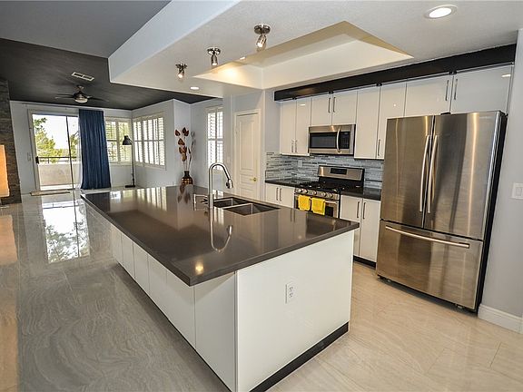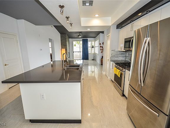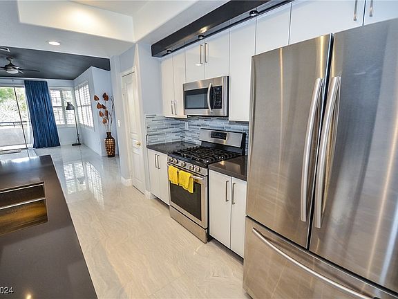 See this modern and upgraded 2-bedroom, 1 car garage unit in the heart of Summerlin! Fully renovated from top to bottom! The kitchen is totally upgraded with black Quartz counters, breakfast bar, and stainless steel appliances. Beautiful white tile flooring, plantation shutters, and custom paint throughout the unit. Very open floor plan! Living room has a fireplace with stone accent. The relaxing balcony overlooks mature trees. Primary bathroom and guest bathroom have been totally upgraded! Unit has an attached 1-car garage with epoxy flooring and entrance to the unit! See this one today!