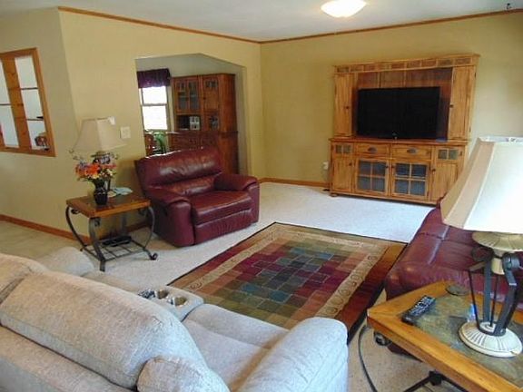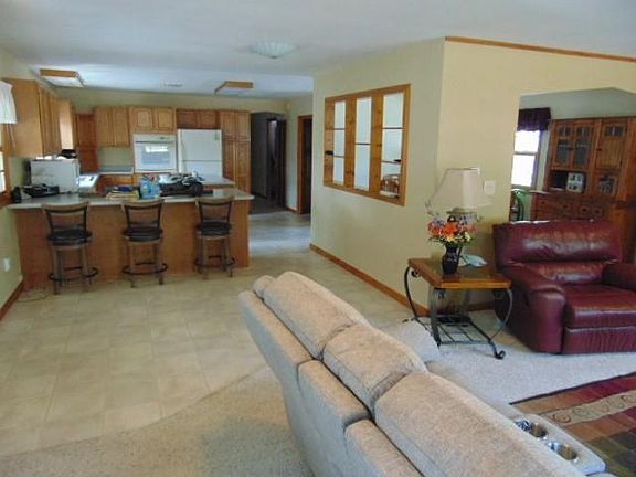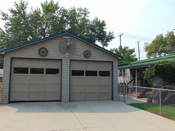 Appearance and amenities say everything! This double wide mobile offers 3 bedrooms, 2 baths, large kitchen-open living room, and separate dining room. The interior was completely re-done, down to the studs with sheet rock, new windows, new truss roof (metal) including metal siding on the home. The garage has room for 3 vehicles with 8' doors, stairs to attic for storage, heated. There is a covered patio with trex deck, 2 large storage buildings on concrete, chain link fence, UGSS, well/pump and landscaped. Shows beautifully. Home is not on a permanent foundation.