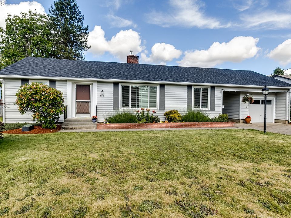 This charming home has so much to offer! Beautiful hardwood floors and newer stain master carpet (Hardwood underneath.) New roof, recently updated vinyl windows, hot water heater and tile. Large private backyard with covered patio, tool shed, mature landscaping. Ample storage throughout. 10x16 shop with 220. RV parking! Close to Petersen Barn, schools, shopping and freeway access. Quiet street of well-kept homes. Move in Ready!