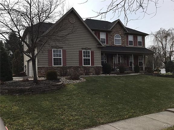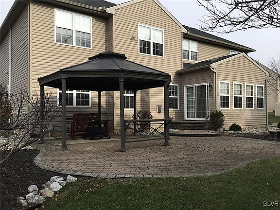 Popular Brandywine Village II in East Penn School District is the setting for this well maintained 4/5 bedroom, 3 bath colonial with elegant stone front and three car garage. Impressive two story foyer entry leads to large dining room and living room with hardwood floors offering timeless beauty and sophistication. Perfect living flow on this main level leads to large 20x16 family room with gas fireplace, and first floor office or fifth bedroom with full bath. The stunning eat in kitchen features a spacious center island w/ granite countertop, a stylish tile backsplash, and a large eating area which opens to a simply impressive 17x13 four seasons room overlooking a one of a kind rear stone paver patio and gorgeous gazebo. The second level offers extremely large four additional bedrooms, MBR 20x14, with walk in closet and full master bath. Three bedrooms 18x13, 16x13, and 16x12 and full bath are perfect for the growing family. The finished lower level provides additional living space with home theatre room, game room area( quality Olhausen pool table to remain) and separate fitness area. Located in desirable Lower Macungie Township, this impressive home is located close to top rated schools, shopping, dining, parks and Brookside Country Club.
