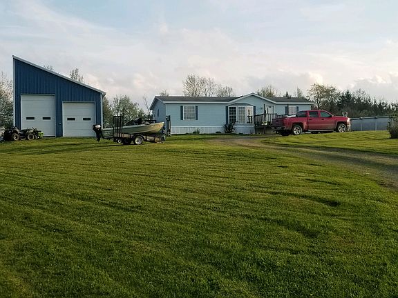 3 bedroom, 2 bath doublewide on beautiful, secluded 3.9 acre lot. Large front and back yards great for kids or pets! Large deck off the back of the house to sit and enjoy natures peace and quiet. Large living room with gas fireplace, open kitchen and dining area W/ vaulted ceilings, sky lights and laminate flooring. Main bedroom suite has garden tub and shower. All electric with REA 200 amp. Super 2 bay garage/barn/workshop with one 9'6 door and one 11'10 door. Borders Mossy Bank Park Pond.