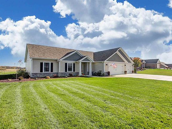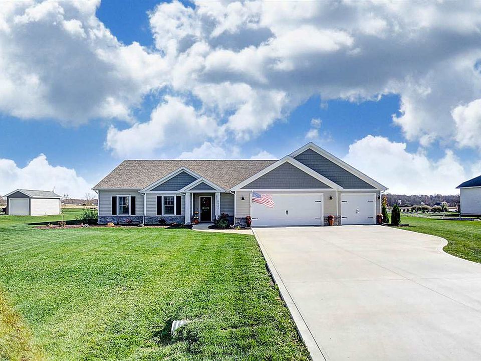 Just approx 10 minutes North of Dupont Rd / I-69 area. Granite Ridge Built home just under 2 years old. Three bedroom Ranch with approx 2002 sq.ft of living area. Great room with surround sound that is open to kitchen and dining area. Granite counter tops and stainless steel appliances- Range, dishwasher and microwave are included with home. Walk in pantry closet. Master bedroom suite with walk in closet and 5 ft shower. Flex room with cabinets and refrigerator off kitchen area. Laundry room separate with built in lockers for kids. Three Car attached garage. Garage door operators on both doors. Oversized patio 16 x 25 and home sits on 1.44 acres of land. 90 Plus Gas forced air furnace with central air. Water softener included. City sewer and well.