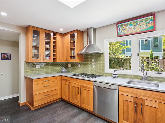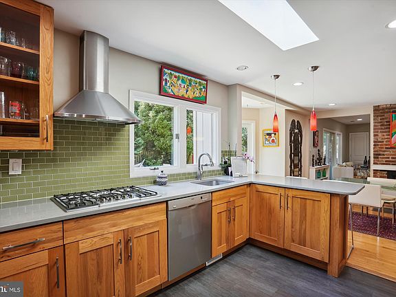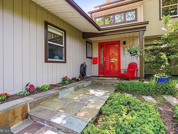 Welcome to this renovated mid-century contemporary in highly sought-after Bannockburn with 4 bedrooms and 3 updated bathrooms. This dramatic home has been extensively renovated, blending light-filled interior spaces and dramatic modern design with the natural exterior landscape. This sun-drenched residence offers a dual sided fireplace, 4 skylights, generous room sizes, and tasteful architectural details throughout. Enter into a welcoming two-story foyer with decorative display nooks and an open closet. The bright living room has a fireplace, a picture window, recessed lighting, a storage closet, and opens to the delightful screened-in porch with fantastic backyard views. The light-filled dining room has a dual sided brick fireplace, modern lighting fixture, and opens to the kitchen and the living room. The thoughtfully designed chef’s kitchen is highlighted by gorgeous wood cabinetry with mini glass subway tile backsplash and solid surface counters, a Bosch stainless steel appliances suite, a breakfast bar, pendant lighting, a five-burner gas cook-top with a stainless-steel exhaust hood, excellent prep space, and both a walk-in pantry and separate pull-out pantry cabinet. Off the kitchen is a cozy family room with wood tile flooring, tongue and groove ceiling, and a perfect office nook. There are two bedrooms and two full bathrooms on the main level, including the primary bedroom suite with a large walk-in closet, recessed and overhead lighting, and a private renovated full bathroom with a marble vanity, a glass enclosed shower with a recessed nook, colorful glass tile accents, a towel warmer and porcelain tile walls. The main level is complete with a laundry room and a coat closet. Upstairs are two bright bedrooms with tree-top views and an updated dual entry bathroom. The beautiful grounds provide a serene and private setting with a fenced backyard, stone accents and beautiful flagstone patio, mature and colorful plantings (hydrangeas, a fig tree, and red flowering climbing vines), and a shed. The enchanting, screened porch has a gabled roof with a ceiling fan and is the perfect spot for entertaining or relaxing! Fabulous location - This house sits on what's called "the hook" of E Halbert, a quiet cul de sac that is the venue for communal basketball games and street block parties including an annual Halloween potluck. The Bannockburn Swim Club and Clubhouse just down the street is the jewel of the community, which houses a nursery school, community events and a lovely playground. Great location – close to Glen Echo Park, the Chesapeake and Ohio Canal Towpath, and Downtown Bethesda. Easy access to River Road, Massachusetts Avenue, Clara Barton Parkway, the GW Parkway, Chain Bridge, I-495, and just minutes to DC.