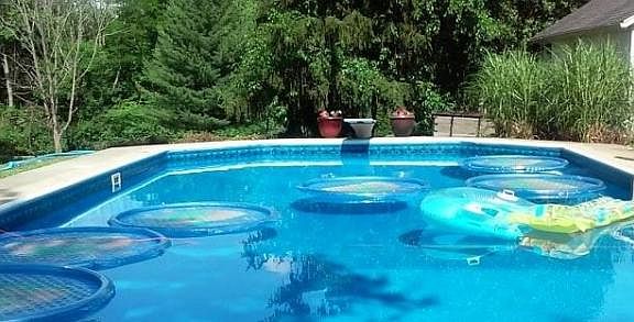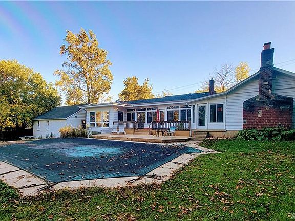 Country 3 bedroom home with covered front porch on an acre of land! A new roof was installed in 2019 on both the house and shed and the main plumbing line was replaced around 5 years ago. The master bedroom features a large wood-burning fireplace with new laminate flooring and access to the large sunroom. The other bedrooms have 2 closets each and one has a built-in desk. The kitchen has newer countertops and lots of storage. The bathroom features a vanity mirror and there is a laundry shoot to the basement in the hall. It has a walkout basement with a half bath, 2 sump pumps, and More Storage! The large bonus room in the back has a ton of natural light and a great view of the backyard it would make a great office or extra bedroom. The back features a brick patio and wooden deck next to the in-ground pool. The pool has a diving board, a new liner and has been winterized for the season. There is a 2 1/2 car garage which has a second floor for storage and extra storage below.
