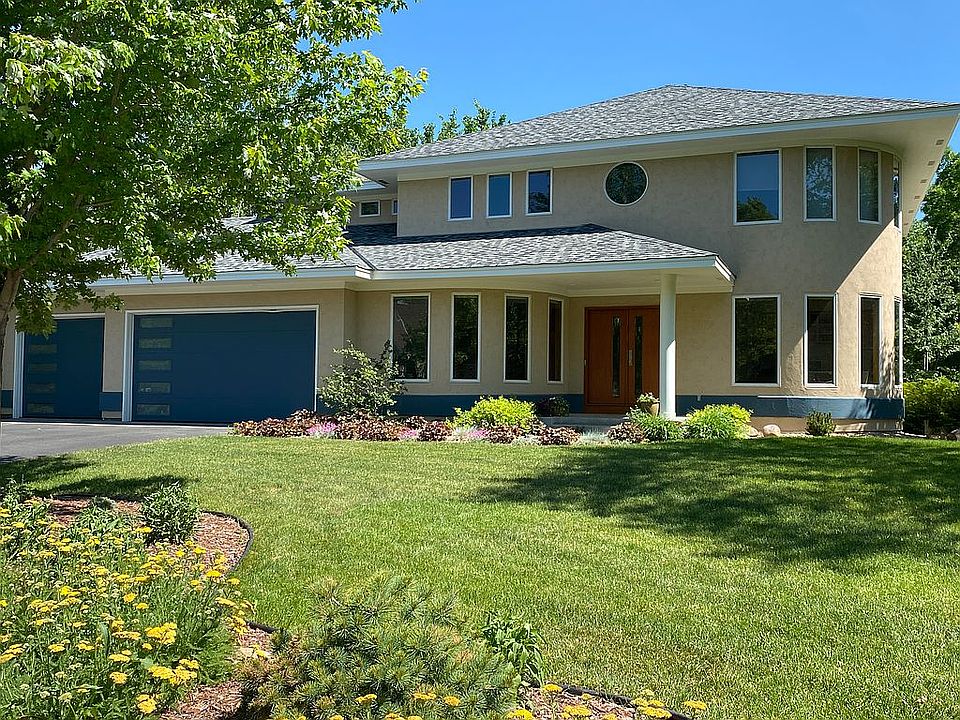 Stucco home built in Art Deco style as model home for a 42-home development in 2002. Sits on a bluff overlooking a 260' stream, mature hardwood forest, and native plant gardens. Fully remodeled 2018-2024. Artisan touches throughout, including a three-story circular staircase that connects all three-levels, all furnished in a consistent design and color and connected by a cantilevered central foyer leading from upstairs sleeping quarters down to a large entertainment center on the lower floor. Remodeling includes new roof and exterior surfaces, new entry doors, new rear deck, all new kitchen appliances and cabinets, new granite island and custom backsplashes, new master bathroom and bedroom, new cherry hardwood flooring throughout first floor and new luxury carpeting in third floor foyer, four upstairs bedrooms, and entire basement entertainment room and 5th bedroom. Highly efficient home includes ambient heating throughout basement.