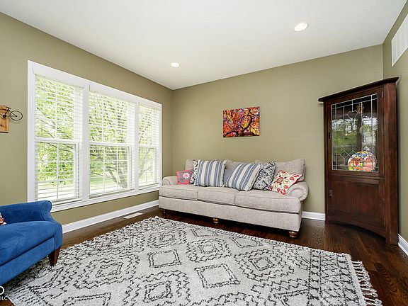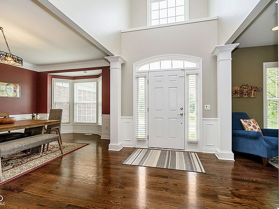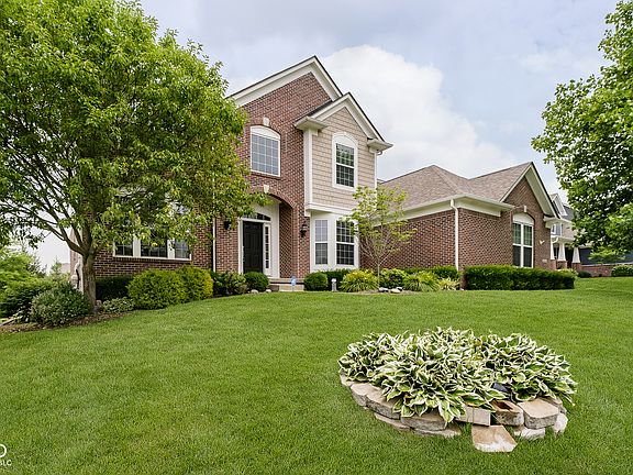 Welcome to luxury living in Cherry Creek Estates. This elegant 5-bedroom, 4.5-bathroom home impresses from the outset with a grand two-story hardwood entry and soaring ceilings throughout. The heart of the home is the gourmet kitchen featuring stainless steel appliances, a gas cooktop, double ovens, granite countertops, and a spacious center island. Adjacent is a striking two-story great room with a fireplace, complemented by a formal dining room with a bay window, and a living room featuring wainscoting and crown molding. A private den/office with French doors offers a quiet retreat, while hardwood floors grace most of the main level. Upstairs, the master suite includes cathedral ceilings, a walk-in closet, and a luxurious master bath. Three additional bedrooms include one with a private bath and another connected by a Jack-and-Jill bathroom. The custom finished lower level is perfect for entertaining with a stunning wet bar, decorative backsplash, wine rack, fitness area, recreational-playroom, theater, guest bedroom, and full bathroom. Outside, a spacious deck overlooks a private lot with mature trees and professional landscaping, complete with an irrigation system. Residents enjoy access to community amenities such as a pool, park, trails, basketball and tennis courts, all within the award-winning Carmel Schools district. Schedule your showing today to experience the luxury and comfort this home offers in Cherry Creek Estates!