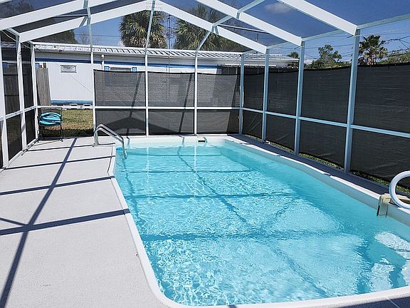 Stunning 4-Bedroom Home on Quarter-Acre Double Lot with inground Pool & Lanai Welcome to this beautifully remodeled 4-bedroom home situated on a spacious quarter-acre double lot just minutes from the Gulf. This property has been upgraded with new finishings and modern conveniences throughout. Enjoy the open-concept layout featuring brand-new luxury vinyl plank flooring over ¾" tongue-and-groove plywood subfloors, updated plumbing and electrical. All of the interior walls have been completely replaced with new ½-inch drywall, and the home features solid wood baseboards and custom wood case moldings for a refined, modern finish. The kitchen showcases newer cabinets and countertops, and the entire interior and exterior have been freshly painted. A 4-ton central heat pump system provides year-round comfort, new water heater and the roof has been recently resealed for added peace of mind. Step outside to your private outdoor retreat featuring a poured concrete pool deck, screened lanai, and in-ground pool — perfect for entertaining or relaxing in the Florida sunshine. You can also enjoy your private fenced back yard. The home also includes a separate laundry room with washer and dryer included, as well as three utility sheds and ample outdoor space for gardening or expansion. This one-of-a-kind home is permanently affixed and titled as real property. Therefore it qualifies for a mortgage. Don’t miss your opportunity to own this exceptional residence near beaches, shopping, and dining.