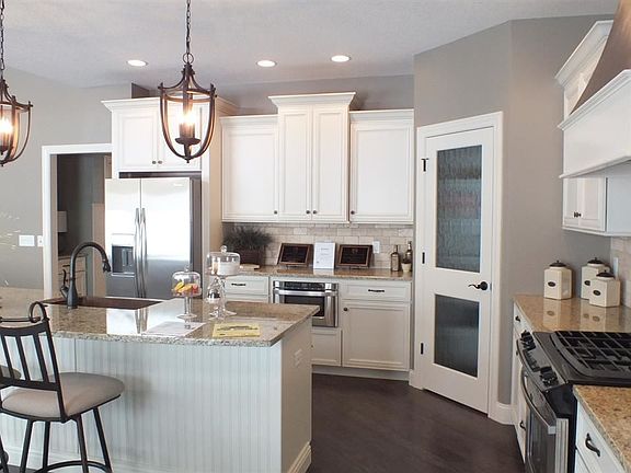 This is a fabulous new Model home and floor plan, by Aspen Homes. An open entry leads you to the cathedral great room with a new angled coffered ceiling treatment. Corner gas fireplace. The kitchen has an abundance of cabinetry, copper finished farm sink, wood floors thru the main living area. Built in niche and bump in head board in Master are nice features. Master Bath has a large walk in tile shower, and oversized Master closet. The family entry has custom built in lockers. Lower level is fully finished with rec room and bedroom and bath.