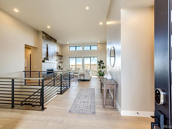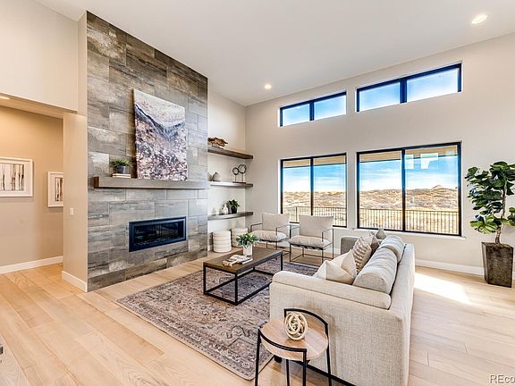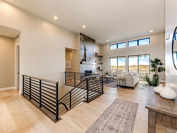 Amazing, Berkeley new construction, 4-bedroom, 3.5-bathroom home backing to open space in the Canyons at Castle Pines. Step inside and be instantly impressed with this open concept and soaring ceilings. On the left you will find the brightly lit study with hardwood floors and double glass French doors and mountain views. Beyond that lies the expansive open main floor living area lined with wide planked hardwood floors and a wall of upgraded windows. Amazing natural light abounds throughout this home! The entire back of the home views the dedicated open space to the east. The extended covered deck is pre-plumbed for a gas grill and the lower patio has a gas line to the back yard for a fire pit. It is perfect for entertaining many guests and family. The living room guides you into the gourmet chef’s kitchen with striking two-toned cabinetry, upgraded Thermador Pro appliances to include, a built-in fridge, microwave drawer, dishwasher, an oversized island, induction and gas cook top. Walking to the other side of the living area you’ll discover the main floor's primary master suite lined with walls of windows overlooking the same impressive open space. In the luxurious 5-piece primary bathroom you will find heated floors, double vanities, a walk-in steam shower, a large soaking tub and the closet lined with custom built-ins that leads to the laundry room with Electrolux washer and dryer and laundry sink. Enjoy a second bedroom on the main floor with a beautifully appointed full bathroom and mountain views. Step down to the finished, walk out basement to discover a large living area with more wall-to-wall windows viewing the open space. Enjoy hosting guests with the built-in wet bar that includes a beverage fridge and dishwasher. Also, on the walk-out level you will find 2 additional bedrooms and a beautifully appointed 3/4 bathroom as well as a gaming area and large unfinished 500 sq ft space for extra storage and recirculating tankless water heater. Rare location!!