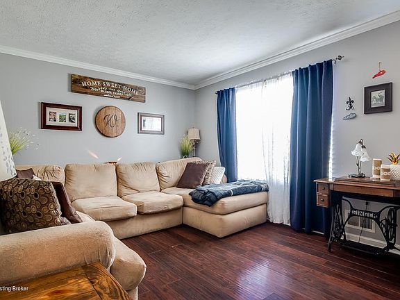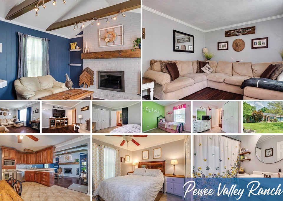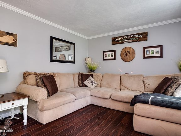 Natural light floods the living room at the front of this cozy 3 bedroom ranch in Pewee Valley. Gorgeous dark flooring contrasts nicely against the light grey wall colors throughout main living areas. Multiple living spaces can be utilized for formal and informal options or provide the next owners with room to spread out. Abundant cabinetry offers ample storage and tile flooring makes for low-maintenance clean-up post dinner. The generous kitchen is equipped with stainless steel appliances and a peninsula countertop. Place bar stool seating here to entertain guests and good conversation during dinner prep in the kitchen, or utilize as added work space. Just off the kitchen is the rear den. It is on-trend with a beautiful white brick fireplace and rustic wood beam mantle that (CONTINUED) >> ties in nicely with the wood beams stretched across the vaulted ceiling. A door in this room leads out the back patio and flat yard perfect for all of your summertime activities. Of the 3 bedrooms in this home, bedroom 1 is a generous size with a spacious closet and a fun chalkboard accent on the wall. Bedroom 2 has a large window and the closet provides ample storage. Bedroom 3 is the smallest and serves the current owner's as a bedroom yet could also serve as a nicely sized office or play area. The full bathroom is updated and the finishes would easily suit the taste of everyone. This home's location is desirable to those who enjoy the amenities offered in both Oldham County and East Louisville as it is right on the edge of Oldham. Enjoy Oldham County Schools and a quick 10 minute of less commute to the Gene Snyder, I-71, Kroger, and nearby restaurants and shopping. Don't miss your chance to view this move-in ready home in person, call us today for a private showing!