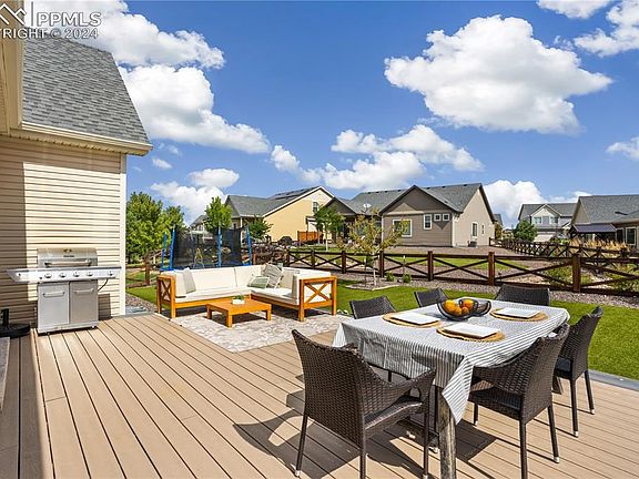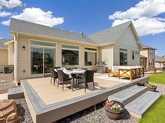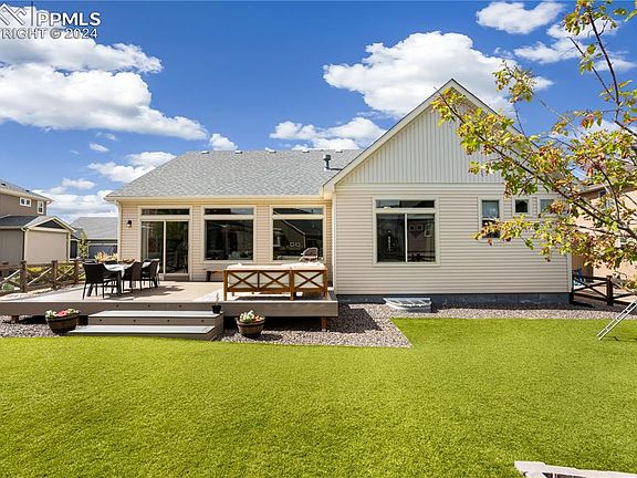 Stunning ranch home located in the highly sought-after Banning Lewis Ranch community with 3 car garage & cold central A/C! This charming family home features open concept living, expansive windows, wide hallways, new contemporary LVP flooring, new lush carpet and modern design touches throughout. The backyard is a true oasis, featuring a large composite deck and high-end pet & kid-friendly turf. Eye-catching curb appeal with a beautifully xeriscaped front yard & covered front porch. As you enter the home, you are greeted by 10ft ceilings and a family room centered around a cozy gas fireplace w/ stone surround & open shelving. The kitchen has a massive center island, granite counters, stainless steel appliances, kitchen pantry and an abundance of cabinets & counter space. The primary bedroom suite features tray ceilings, walk-in closet, and a private en-suite bathroom with double vanities, granite counters and a walk-in shower with floor-to-ceiling tile & glass door. 2 additional bedrooms and a full bathroom are conveniently located near the primary suite. A dedicated office, laundry room, mud room & 1/2 bath complete this level. The finished basement has 9 ft ceilings, sizable multi-purpose rec room, bedroom with walk-in closet, full bathroom, and an oversized unfinished storage area w/ plumbing rough-ins, which can be finished into an extra bedroom and bathroom or a junior suite. South-facing driveway for easy snow melt, and a huge 3 car garage w/ 220v power & epoxy floor. Banning Lewis Ranch is known for its abundant amenities including an outdoor water park, pool, pickleball court, dog park, playgrounds, summer concerts, community events, and countless walking & biking trails. Don't miss the opportunity to own this remarkable home in a vibrant community. Schedule your showing today! **Includes kitchen fridge, whole house humidifier, whole-house water filter, independent temp controls in basement and main level & Ring Doorbell. Ceiling fans in all bedrooms.**